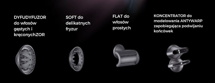 Zestaw zawiera komplet profesjonalnych nasadek do stylizacji: koncentratory, dyfuzor oraz końcówkę do fryzur delikatnych.