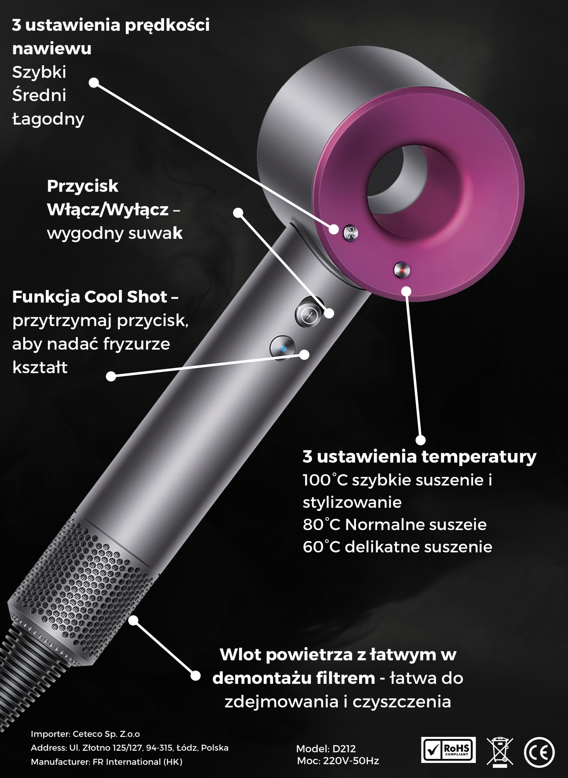 • Tryby: 3 prędkości, 3 temperatury + Cool Shot